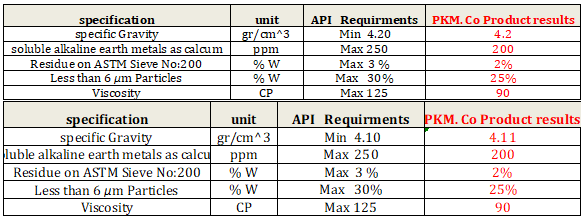 در جداول زیر مشخصات فنی دو نمونه پودر باریت تولید شده توسط ماهان کاوان بحر آسمان در مقایسه با استاندارد API آورده شده است.